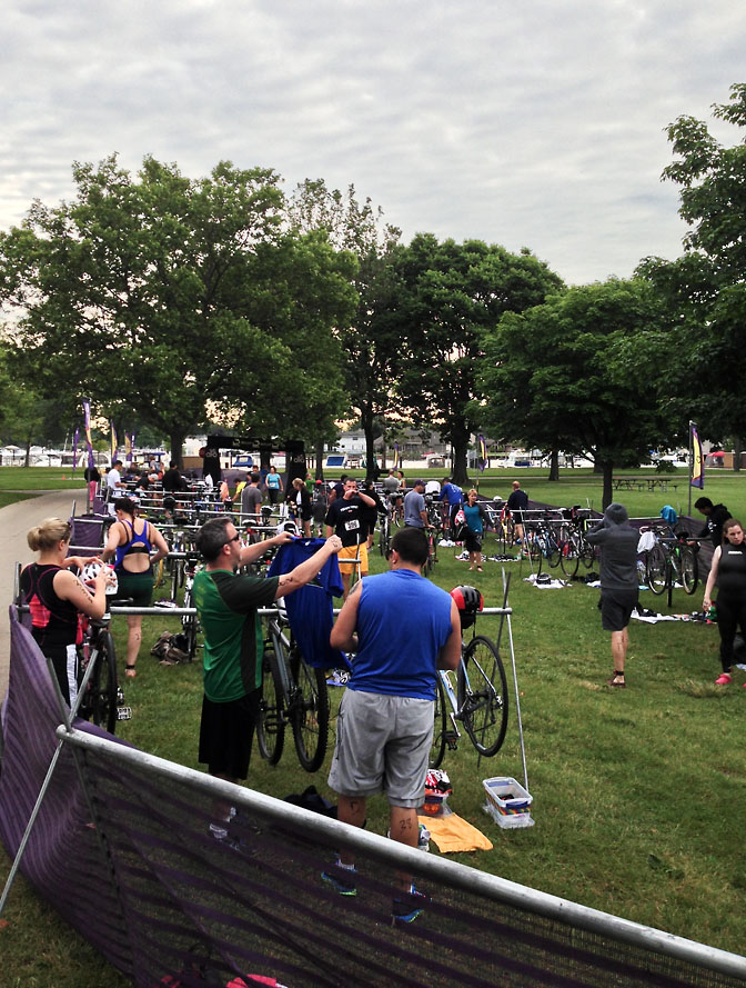 These race mornings roll around awfully early, and I was out the door around 5:45. The transition area was due to close by 7:20, so I got there about an hour before that. The transition area was in Depot Park in downtown Clarkston, and I had no problem finding parking in the lot right by the park. I checked in then took my gear to the transition area. Along the way, I stopped at a tent where there was a guy from Fraser Bicycle. He was helping people with their bikes, so I had him look at my brakes. He tweaked a thing or two and said I should be fine. It’s so cool of them to help people like that.