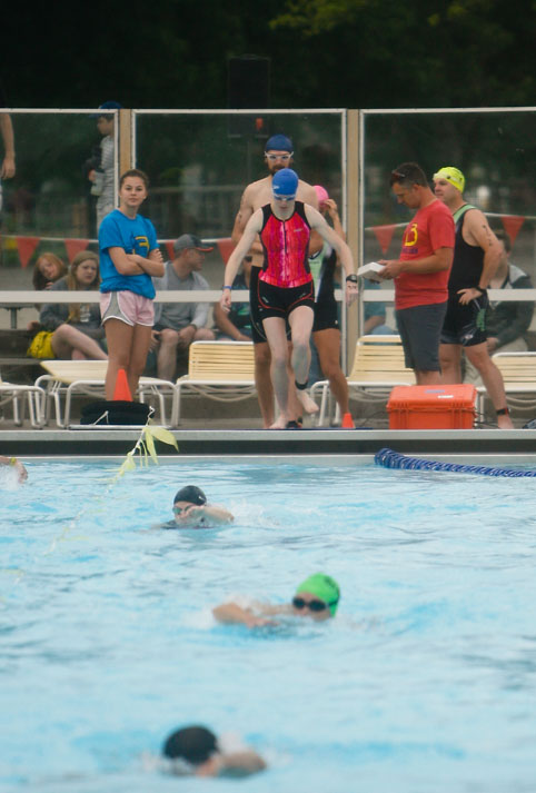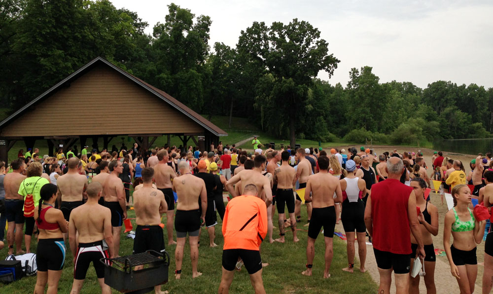 When I got to the transition area, a few racks were completely empty, so I was happy that I could set up with room to spare. As the transition area closed, everyone started the trek to the beach at Deer Lake. The race people had warned us ahead of time that it was a good 600 meters to the beach and we might want to bring shoes. I opted to wear some cheap water shoes, which I was able to leave in an area where we entered and exited the beach. Then, it was time to stand around and wait. It was cloudy and in the 50s, so it wasn’t long before I started to shiver. As I waited, I was pleasantly surprised that Matt showed up! He didn’t come with me to this race, but he did surprise me by coming a little bit later. I’m extremely lucky that he’s so supportive, and equally lucky that he takes some great photos! He gets credit for all of the nice race photos here.