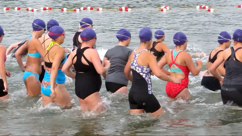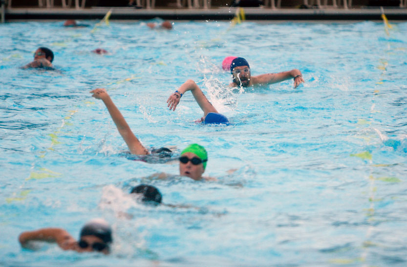 The race meeting happened about 10 minutes before the start of the race, and all of the women went in the first wave at 7:45. Although it was a bit on the cold side standing around in my tri suit, it really was good weather for the race. The water was 76 degrees, which meant people could wear wet suits. However, after standing around in the cold air, the water felt pretty warm when I got in.
