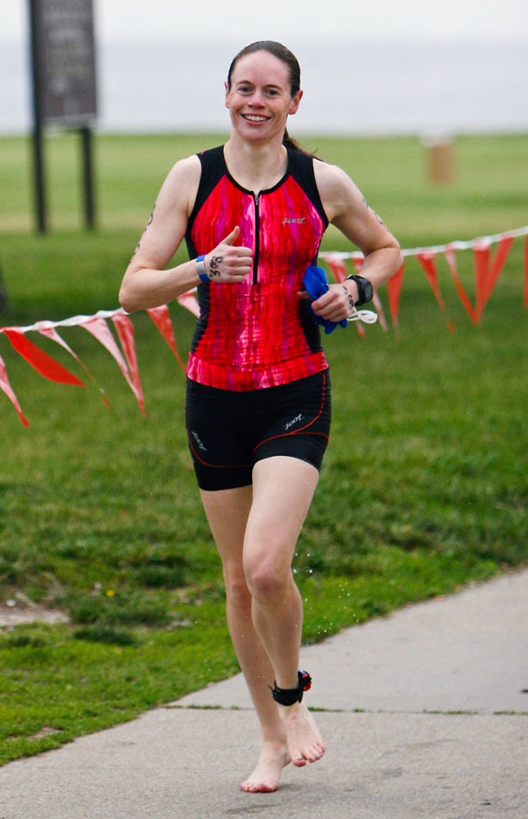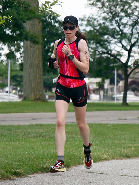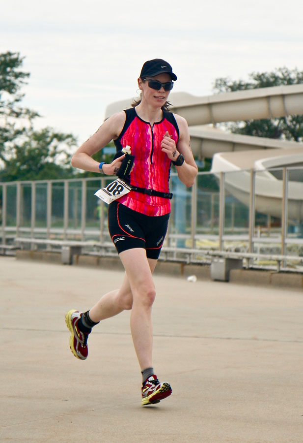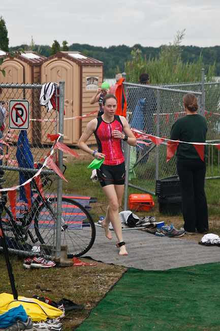 I had my usual funky feeling in my legs following the bike, but my starting pace was better than usual. The run took us around a paved path and through the park for two loops. It was a little bit rolling, but nothing too dramatic.