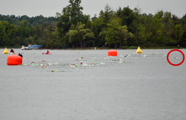 We swam in a rectangular pattern with the orange buoys on our right side on the way out, around the yellow buoys at the end, then back around the second set of orange buoys. The surface was kind of rocky as I got farther out in the water before the start, which slowed me down as I hopped amongst the rocks to get to the starting point in the water. I was a little ways back at the start, and out to the left side. There was a moment or two when a couple of us were pretty close, but I didn’t have any problems with that for the rest of the race. The water was a greenish-brown and I couldn’t see much of anything. I didn’t feel like I had to lift my head to sight too often during this swim. However, I realized after a while that I was probably a bit too far to the left of the buoys. I tried to work my way back in, and got right by the buoys at the turn around point. Yet after that, somehow I strayed again.