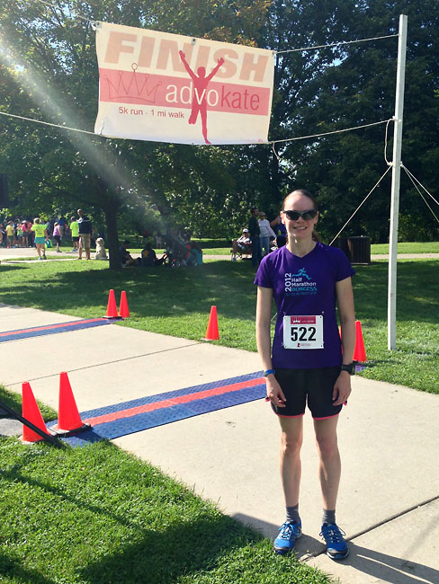 This was the 7th year for the AdvoKate run, which raises money for St. Jude’s in honor of Kate Hrischuk, a 6-year-old who lost her battle against a tumor in her brain stem. We were happy to support this great cause. Packet pickup and new registrations took place the day before the race at Runnin’ Gear, so I went there to sign up. The packet included a cotton t-shirt, as well as a thin Gatorade towel. I’ve never received a towel in my packet, so that was something new and cool.