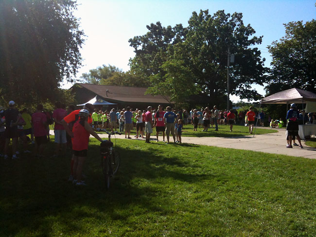 The weather was perfect the morning of the race – in the low 60s and clear. The race began in Rochester Municipal Park, which is an easy jog from where we live. With 8 miles on my schedule, Matt and I chose to run down to the park, allowing me to get 1.8 miles in before the race. We got there with about 15 minutes to spare and found a pretty large crowd scattered throughout the park. Around 600 people took part in the race.