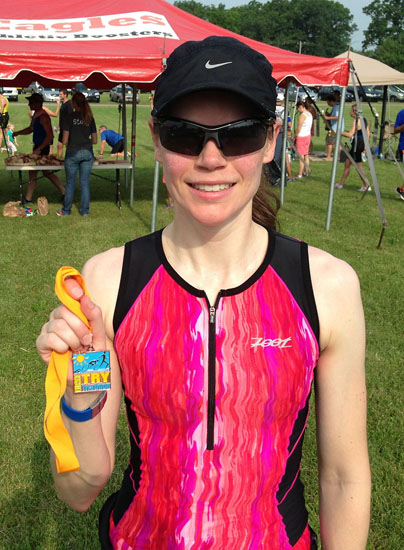 The first real goal of the year was to finally try a triathlon. I’d gotten back to swimming near the end of 2012, I’d been biking a little bit, and obviously I had the running thing down. I took things slowly, starting with a short indoor race in March at the Life Time Fitness in Rochester Hills. 10 minutes of swimming in the pool, 30 minutes on a spin bike, and 20 minutes on a treadmill seemed very doable and gave me the courage to give it a shot. It was a lot of fun and I was surprised to find out that I was the female winner! I realized that doing so well in my first attempt was a sure sign that I should really get into triathlons.
