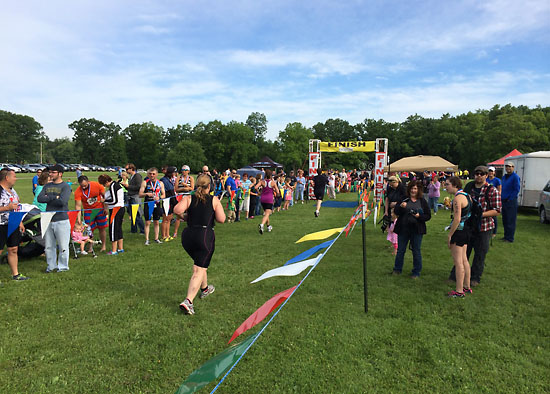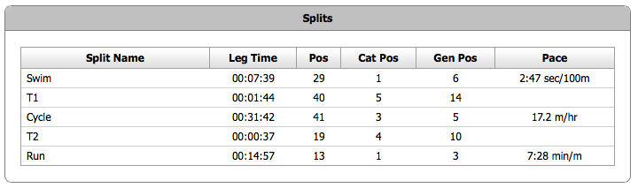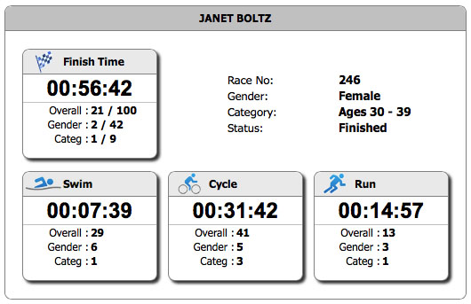 The last part of the race went through a wooded area, and it was a nice way to break things up. At that point I gained on and passed a woman who led by quite a bit on the bike. That helped motivate me to finish strong. I finished the run in 14:57.
