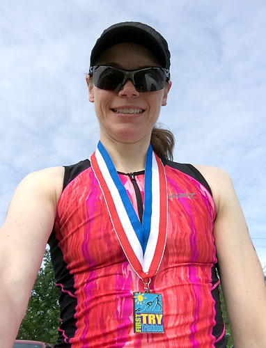 Last year’s First Try Triathlon in Linden, MI was my very first triathlon. I chose it because it was beginner-friendly and the “super sprint” distance (300 yard swim, 9.1 mile bike, 2 mile run) is a little shorter than a regular sprint. It was a great race for my first experience. The race offers both “first try” and “fast try” divisions. The first try is non-competitive and designed for true beginners. The fast try offers awards for people who are looking to be more competitive.