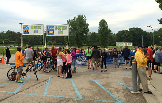 I prefer to have my bike on a rack by the transition’s exit, and that was no problem thanks to my early arrival. I chose a spot right next to a guy with a really fancy bike, so I suspected he knew what he was doing. We talked for a little bit and he gave me some good advice. I found out later that he did indeed know what he was doing – he was the overall winner of the race! He’s 61 years old and races nearly every weekend through the summer. Very impressive!