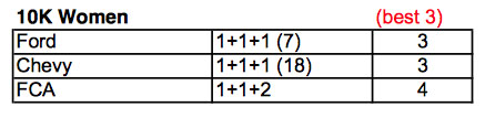 A few days later I found out I was the 5th female overall and had placed first in my age group! That helped my team, who wanted three first place age group finishes for the women. Although the Chevy team had three top women, Ford did as well. Ford’s fastest woman placed 7th while Chevy’s was 18th, so Ford took the win in the 10K Women category.
