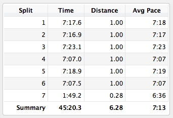 McMillan’s calculator had estimated that I was capable of a 7:12 pace, and I hit 7:13 – pretty close! Someone gave out small cartons of chocolate milk as we exited the track, and the GM tent had bagels, cookies, and some other snacks.
