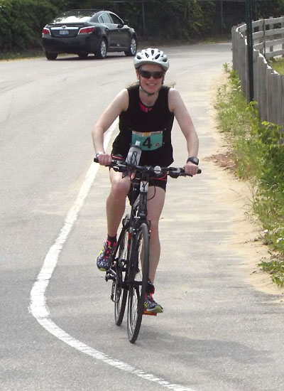 I wasn’t out to win the race and knew that wriggling out of my wetsuit for the first time in a race situation would slow me down in the first transition, so I was okay living with my slow time. I threw on a tank top with my bib, scarfed a few Honey Stinger energy chews, put my socks and shoes on, got my helmet and sunglasses, and finally got through T1 in 2:47.