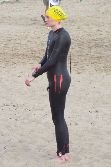 The water was the perfect temperature and I loved this swim. I’m used to swimming in murky lakes with seaweed, so it was awesome to swim in crystal clear water where I could actually see in front of me. I could feel the buoyancy of the wetsuit, but I still didn’t feel especially fast. A couple times people came up along my side closer than I liked, so I’d hold up for a second and go around them on the outside to create some space. Otherwise, everything was great about the swim.
