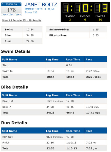 It looks like I placed fifth out of 16 women. Apparently not many women participated in the Olympic distance. I didn’t care much about my placement though. I was just happy that I had improved my Olympic time by 12 minutes.