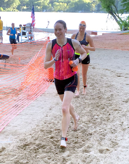 The shoulder was large and the road was fairly smooth, so it was great for a race. I enjoyed riding past campgrounds and lakefront cottages. At times we had really nice views of the water. At a certain point my inner thighs got sore from sitting on the seat for so long. I realized that I’d used padded bike shorts for all of my longer rides and hadn’t practiced long rides with tri shorts. The padding definitely makes a difference! In addition, I had strained my left thumb/wrist pretty bad a couple weeks earlier from gripping my handlebar too tight and for too long. I thought about it during the whole bike portion of the race, making sure I moved that hand around enough so it wouldn’t get irritated.