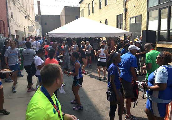 Our bibs had tickets for pizza and beer, so we got those next. Eventually we worked our way back to the MLive building for the Team Challenge after party. There was plenty of food there as well, and I ended up with some watermelon, a brownie, and some cookies. It was nice to have an air conditioned place to sit, and we didn’t even realize at first that they had a tent out back with a dance party!