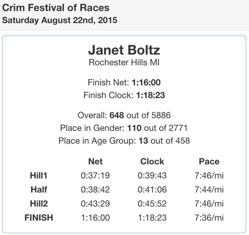 My official time was an even 1:16:00. I thought it was kind of fun that I hit it right on the dot!