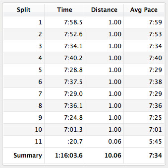 The Twin Cities Marathon in October is my goal race right now, so I did not plan to race all-out. I purposely started easy and finished hard, but didn’t try to hit a specific pace. I hoped to average at least 7:45 per mile if I felt good, but I really just ran by feel.
