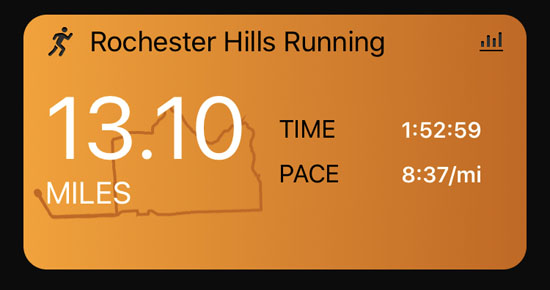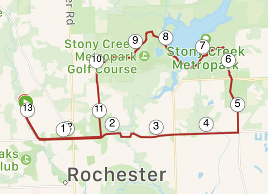 At 9:00 this morning there was a celebration on Zoom to cover all of our achievements and to pump everyone up for one final run. I headed out into some light rain and hoped my body would cooperate for 13.1 miles. I mapped a route that provided some great fall scenery along the way. I started out down Paint Creek Trail in Rochester Hills, passed Van Hoosen Farm, then went to Stony Creek Metropark.