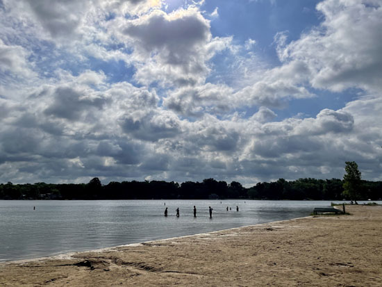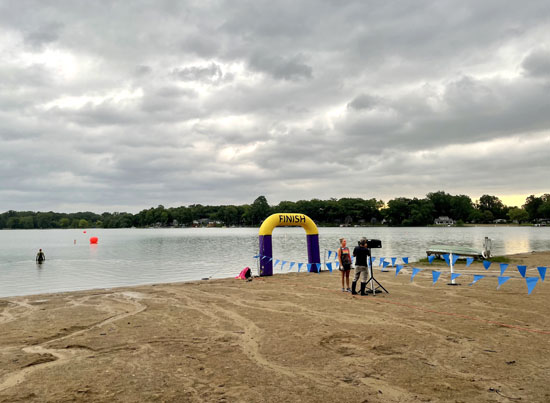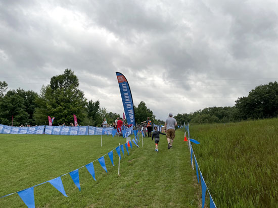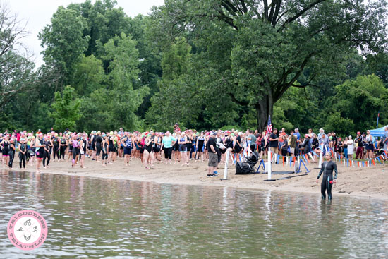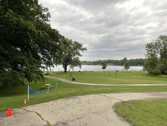 The race took place on a Sunday morning at Big Portage Lake State Park at the Waterloo Recreation Area in Grass Lake, MI. It’s an hour and a half away so the 7:30 start made it an early morning. I was more concerned about the weather than anything else. It rained so much on Friday night that many areas were flooded, including several highways. There were more storms on Saturday night and tornadoes hit a few areas around the state. I wondered if the lake would be flooded or in good enough shape for swimming. Would there be debris on the roads where we’d be biking? Could more storms hit that morning and mess with our race? The weather was decent enough first thing so all I could do was go and see what happened.