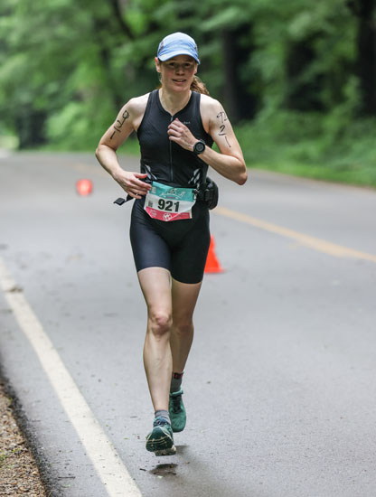 Because of all of the rain the trail surface was pretty soft. It was really sloppy with mud in one spot but not too bad in general. There was one area where I slid and reminded myself that I better watch out for slick muddy spots! Most of the trail was single-track and several spots had trees or branches down to jump over or duck under. There were some pretty good uphills and downhills and I kept breathing heavily the entire run. I definitely pushed myself! The run is where I gained back some of the ground I lost during the bike. I’m kind of in the middle of the pack when it comes to my bike speed but I felt really strong during the run.