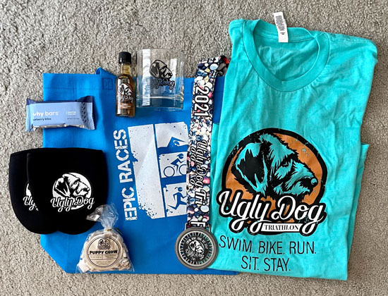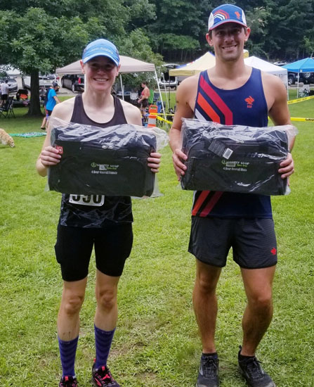 Eventually I recovered enough to get a couple pieces of pizza and some cake. Then I asked if they were giving any awards for our race and Geneva, the race director, went to get a list of times from the timing company. Sure enough, I won! Nick, who I kept swapping spots with on the course, was the male winner. I was extra psyched when Geneva showed me that I had actually finished five minutes before him. I wasn’t just the top female – I was the overall winner too! Kind of cool! I was thankful that he helped push me out there and was glad he had won as well. We received duffle bags that were embroidered with the name of the race.