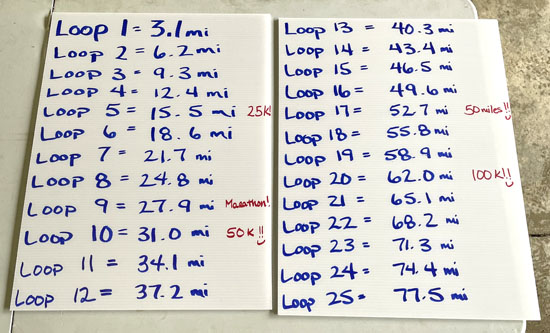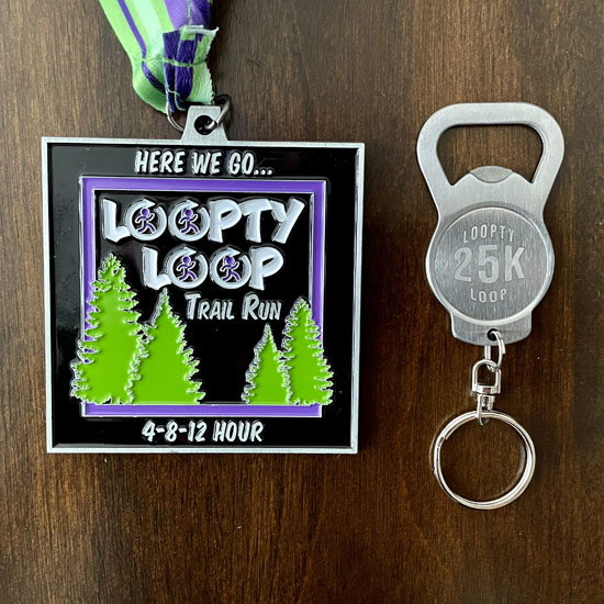At least that stop helped me survive the rest of the final loop. My slowest loop at that point had been 38:11, and my final loop took 44:07. I finished a total of eight loops to give me 24.8 miles in 4:29:32. Since I had completed a 25K after five loops, I received a keychain for that distance in addition to my medal.