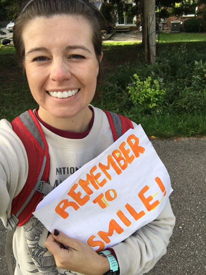 Somewhere around seven miles into the race the REAL hills begin with a straight shot up where we switch from the trail to roads. I live right by that first climb and ran it a few days before the race. It didn’t seem so bad then but it’s always a challenge during the race when I’m actually trying to go fast. I just kept talking myself through the tough spots by reminding myself how well I know the course and that I know what to expect. It definitely helped to have people out there encouraging us through the hills. I saw Carmen again which made me smile and she got a picture for me!