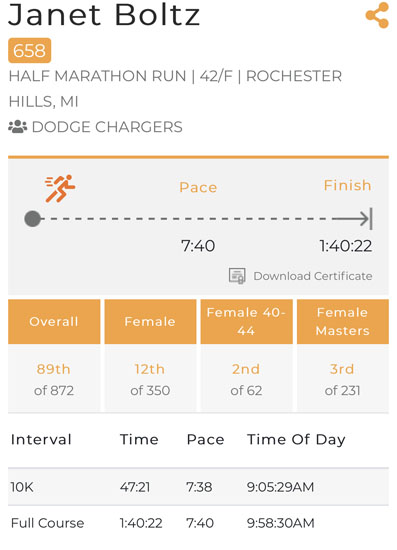 Later in the day I found a spot on the results page that listed the Team Challenge info. Sure enough, my second place age group finish helped my team come out on top! I’m glad I was able to contribute and be a valuable member of my new team. It’s actually the 11th year in a row that they’ve taken the win for the half marathon.