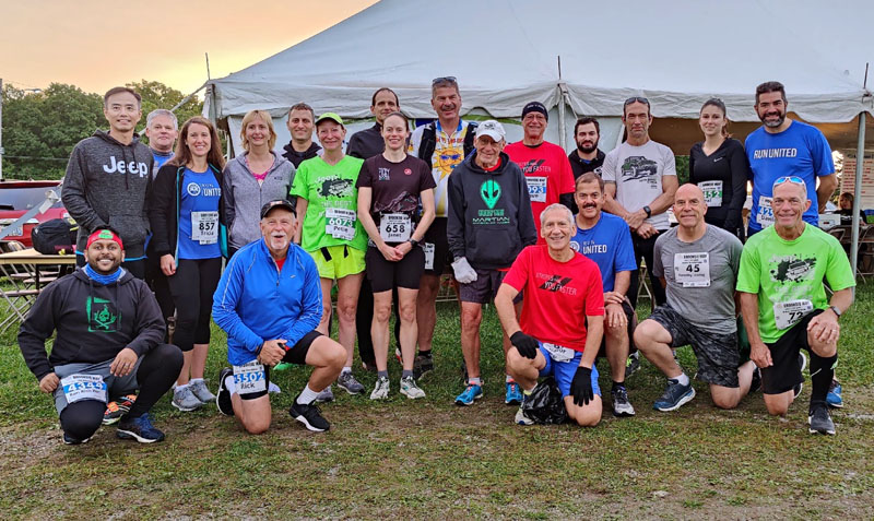 By the time I got back from my jog and grabbed stuff in my car it was almost 7:40 – the time when I was supposed to meet up for a group photo. This was my first opportunity to race as a part of Stellantis’ running team (aka FCA, aka Chrysler) after joining the company in June of 2020. It felt kind of weird not to meet up with the Chevy Running Club that I had been a part of for so many years. I’m so thankful for this new opportunity though where I’m actually a direct hire with benefits instead of being a contractor who was never going to get hired directly. The two companies compete in a corporate challenge every year at this race and I was hoping I could make a good first impression on my new team and run fast enough to help us win the half marathon division. We actually had 40-some people running the various races so obviously not everyone showed up for the photo.