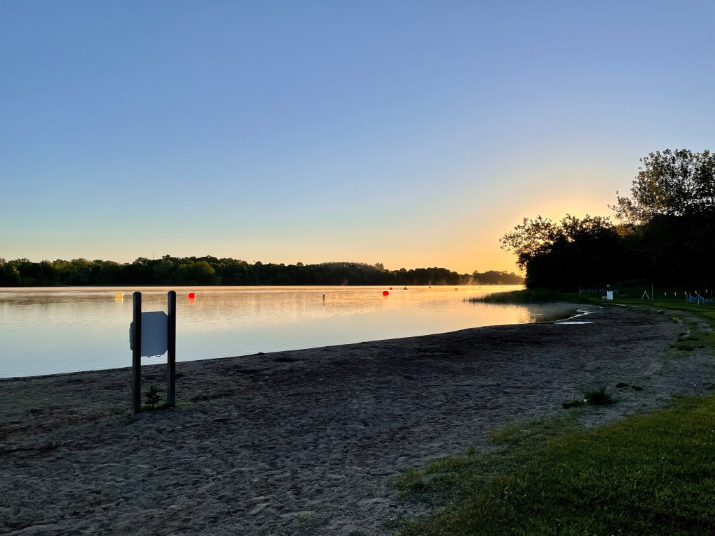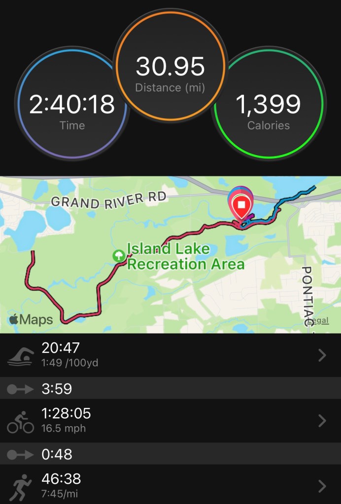 Island Lake Recreation Area is in Brighton, MI. I hit the road around 5am on race day so I would get there an hour before the transition area was due to close at 7:15. It was a clear morning around 50° and the water was 74°. I worried a bit about trying to spot buoys since we’d be swimming directly toward the sun, but with the cool temps and no wind everything else seemed pretty ideal.