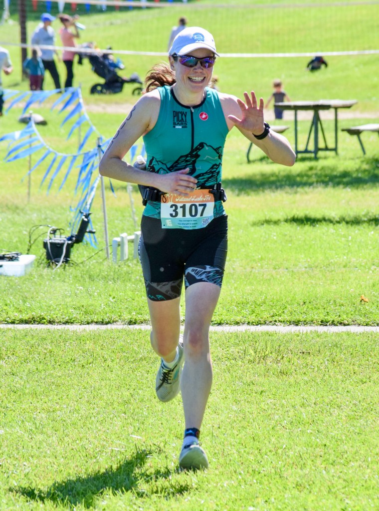 I was shocked as I ran my bike into transition and saw my friend Lisa! I asked what she was doing there and of course she said she was there to cheer for me. I had no idea she was coming so that was pretty awesome. She looked at my past race times to figure out when she might be able to expect me. My transition spot was close to the edge so I was able to talk to her while I racked my bike. Thankfully I’m usually pretty quick during the second transition (48 seconds) since I just had to take my shirt and helmet off and grab my hat. I told Lisa the worst part was over. She said the rest would be easy and I said now I “only” had about 50 more minutes.