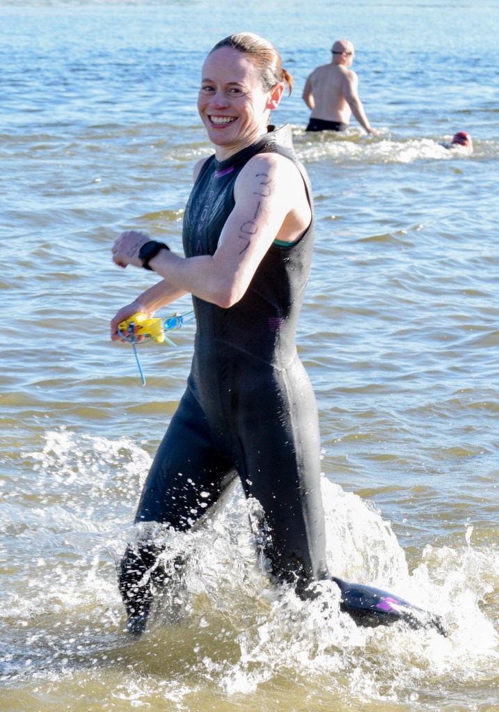 When I approached the beach at the end of my swim and the water got shallow enough, I stood up to wade through the rest and saw Greg Sadler taking photos. He has photographed so many races that I’ve done and we follow each other on Instagram so he recognized me and gave me a nice greeting. He got a good smile out of me when I normally would look beat up coming out of the water!