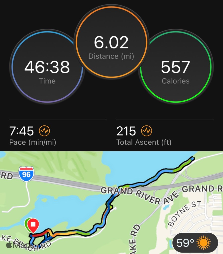 Next it was time for two loops of the run. In the past we’ve always started out by running up a steep grassy hill. I was kind of thrown off that flags routed me a different way and I almost wondered if I was going the right direction. I ended up on the paved path and knew I’d follow that into Kensington Metropark before hitting a turnaround. I was shocked when I looked at my watch and saw that I ran the first mile in 7:25. My legs felt heavy and numb and I guess they were so numb I went faster than I realized. The numbness must have worn off after that because I didn’t keep it up!