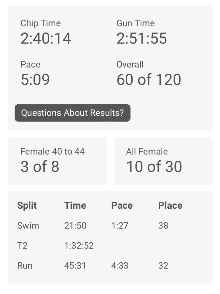 The official results changed a bunch of times as more people finished. They continued to change over the next couple days as certain things must have been sorted out and I think this shows the final standings? Somehow my transition times got messed up and my bike split wasn’t broken out separately, but I know my Garmin is close, give or take a few seconds.