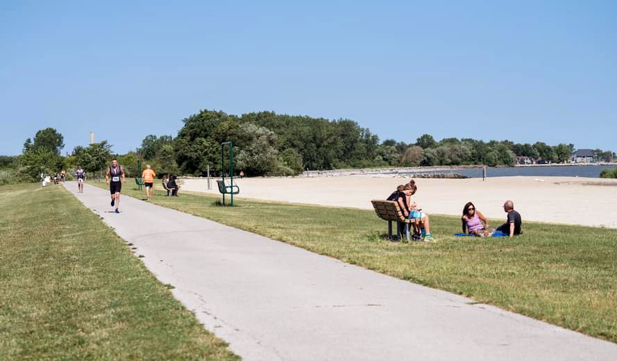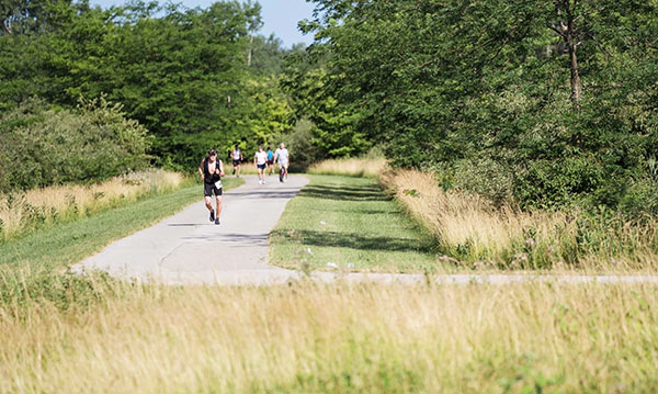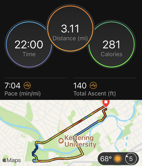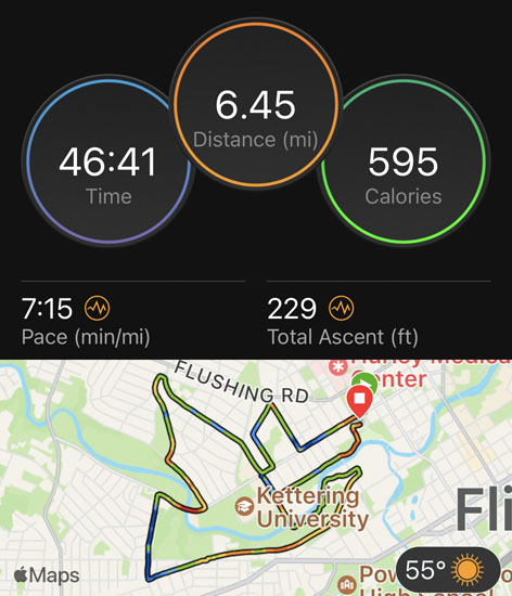 I noticed the blue line on the road that marks the Crim 10-mile course a few times throughout the race. A few parts of the course overlapped with Crim’s course, including a segment of the Bradley Hills. That’s the area with the steepest climb during Crim. Although the hills slowed me down, I was glad to get a little practice on them before running the big race later in August. Plus, there was a nice decline after that which helped make up for slowing down on the hills. Then we ran on the smooth, paved Genesee Valley Trail for a bit. At that point I kept swapping spots with a couple guys in front of me. I’d pass them, then they’d speed up and pass me. We did that for a bit until I gained a little more of a lead as the path continued through a park by the Flint River.