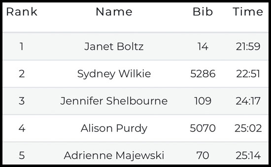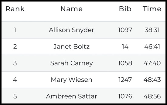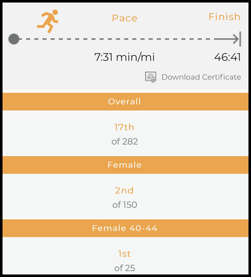 I scanned my bib again and eventually I was able to see the results for the 5K but nothing came up for the duo race. The timing people said that awards would be sent by mail. That was pretty anti-climatic! I guess now I just wait and see if a surprise pops up in the mail one day. I really lucked out that the speedy woman from the 10K didn’t run the 5K because I wouldn’t have stood a chance. Placing second in the 10K and first in the 5K meant I had probably won the duo. Several days after the race those results were finally posted and confirmed that. My total time for the duo was 1:08:39 which good for first place by several minutes! 58 women and 59 men participated in the duo.