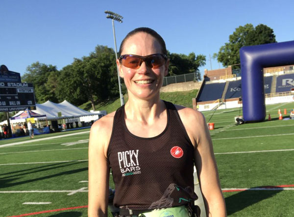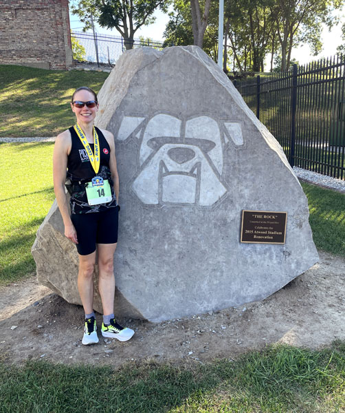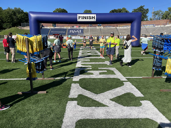 I made it to the bridge and saw police blocking traffic up ahead and assumed they were there because the course headed that way. It was a bit of a climb uphill to reach them and I had to ask where to go because nothing was there to mark the course. They told me I was supposed to go back where I just came from and make a turn on Bluff Street. I was extremely frustrated because it added an extra quarter mile to my race. Several people had followed me up the hill so I had to tell them to turn around and go back to Bluff. All of us who had missed the turn were pretty mad and yelled amongst ourselves that there hadn’t been anything telling us to make that turn. No signs, no cones, no people. A map of the course had been posted and we’re always told to study it so we know where to go, but I’m not familiar with the area and the rest of the course had been marked so clearly I didn’t have to worry about it. I was pretty annoyed, especially when I looked at my watch at 6.2 miles and knew I would have had a new PR – just over 45 minutes. There was one more stretch of path along the river before we got to the stadium’s parking lot. I ran into the stadium and finished on the turf just after the 50-yard line with a time of 46:41.