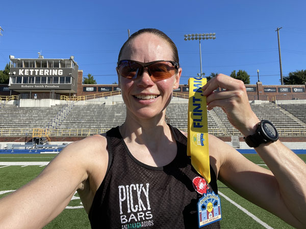 The 10K started at 7:30 so I arrived at Kettering University’s Atwood Stadium about an hour before that. It was kind of refreshing that it was in the 50s first thing in the morning. I was actually shivering! I’ve gotten used to running in the afternoon when it’s been in the 80s and 90s so it seemed like it was going to be a great day for racing.