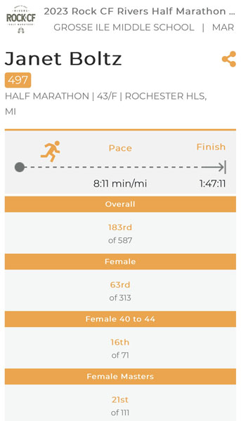 Mile 13 was around an 8:13 pace and I dropped to an 8:00 pace for the final stretch after that. I still didn’t push myself to the max, but it didn’t feel easy either. While I usually have a bunch of smiley race photos, I didn’t get any of those this time!