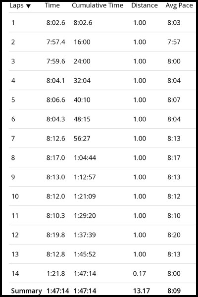 Here are the official results. 1:47:11 was my time which broke down to an 8:11 average.
