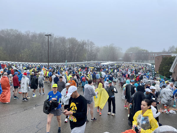 I left the hotel just after 6am to drop warm clothes at the gear check area. I was prepared with a raincoat from the Salvation Army but at least the rain hadn’t started yet. I had more walking to do to so I could catch my bus from the Back Bay area. A running store in Michigan charters buses which is an especially great perk when the weather is iffy. I missed the bus last year so I made SURE I was early this year. My timing was perfect because I ran into my friend Jeff’s girlfriend Jenni and we were able to sit together on the bus. It was great getting to catch up and have good company for killing some of the time.