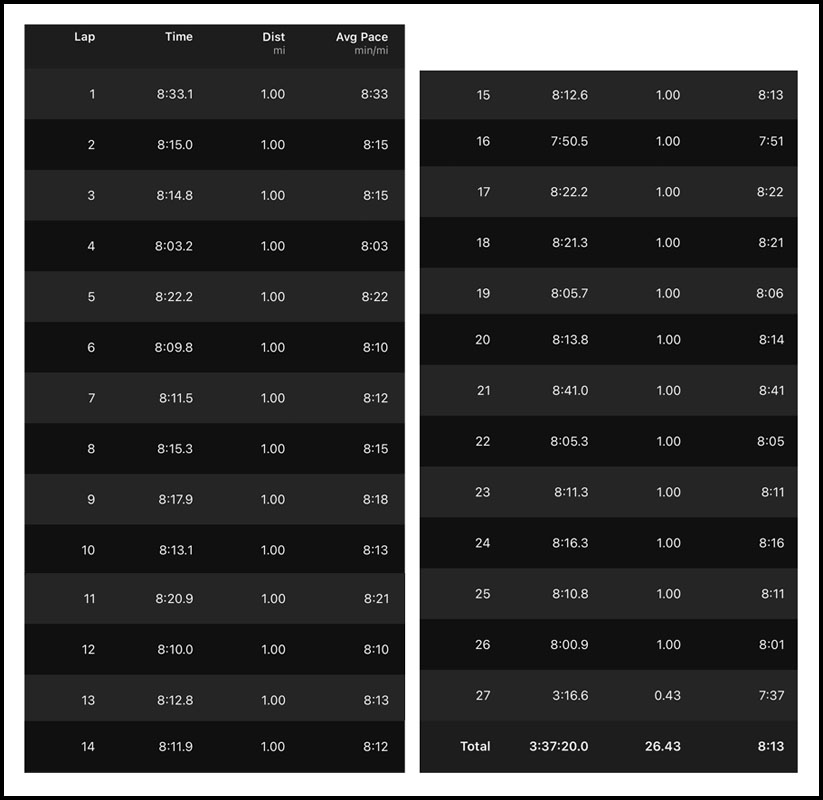 I typically try to train for a 3:30 marathon which means running an average of an 8:00 pace. I’ve only pulled that off successfully at one marathon so far, which was in Indianapolis in 2021 where I ran just under 3:29. Otherwise, it seems like I often tend to finish around the 3:34-3:35 range. My training went well until sometime in March when I developed a pain on the inside of my right knee. That was on top of the left hamstring issue I’ve continued to run through since October. The knee issue caused me to miss three of my long runs, including two critical 20-milers. It took some time to regain some of the fitness I had lost in the couple of weeks I took off and I knew I ought to adjust my goals for this race. Instead of running an 8:00 pace I kind of arbitrarily decided an 8:15 pace might work. After a slower 8:33 first mile, I actually ended up running right around 8:15 for the next couple miles. I basically ran at a pace that felt comfortable and sustainable so maybe I really was on track with that estimated goal.