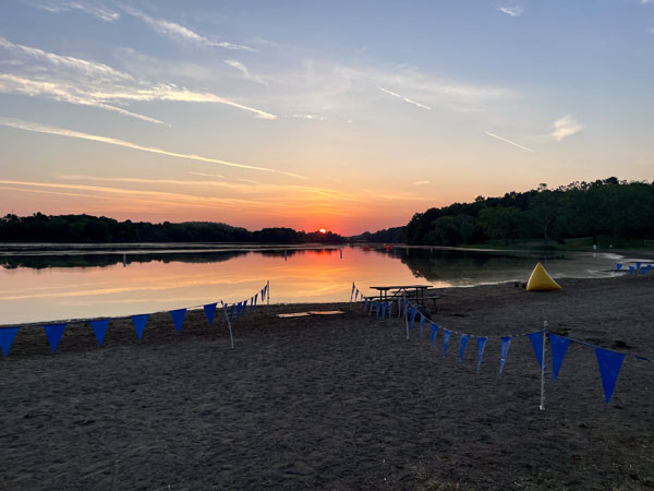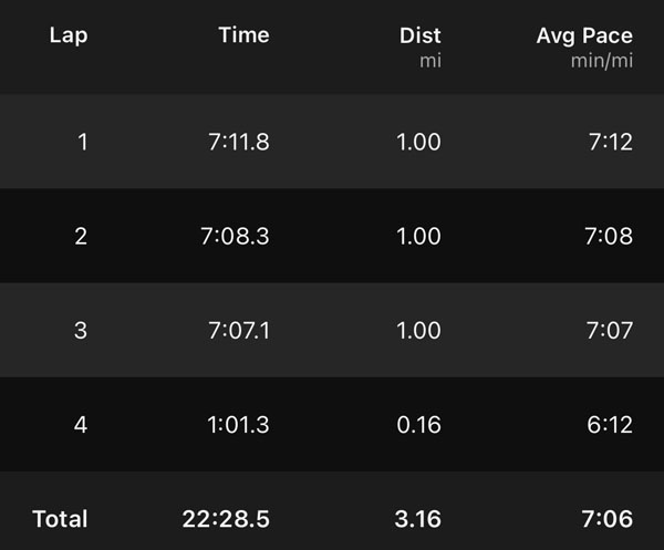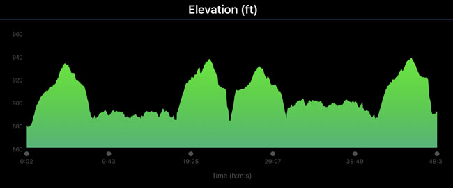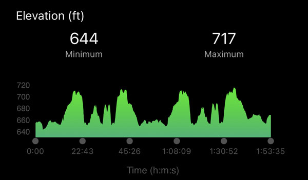 I was on my own for nearly the entire second loop and really enjoyed how peaceful and pretty it was out there. I carried a 21 oz. bottle with an electrolyte mix on my waist, and one bottle kept me going for the first three loops. A great thing about a loop course is being able to leave my own bag along the course. I dropped a bag with several bottles just off the path near the start/finish line and was able to quickly swap my empty one for a fresh one. After a couple loops I also started to eat a Clif Blok around the start and middle of each loop.