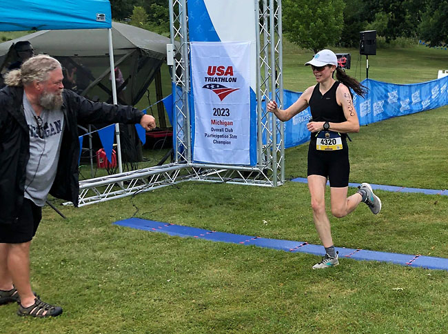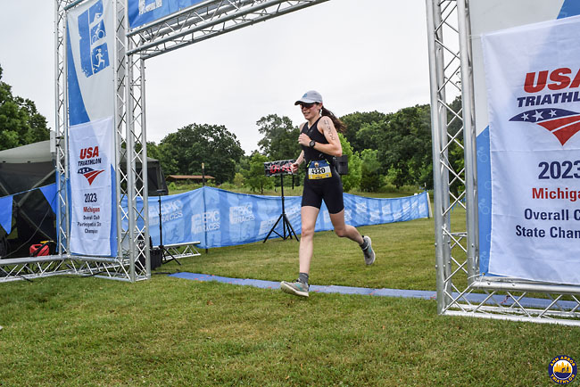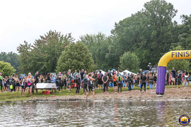 Anyone could do this race, but it also served as the host of the 2023 Michigan State Championships for age group, high school, and clubs, which qualifies people for the USAT Nationals. As a result, it seemed like a slightly different mix of people than I usually see at triathlons. When I lined up for the swim I was a little intimidated because I was surrounded by a bunch of college guys. Sometimes races have separate starts for men and women but everyone lined up at the same time for this start. We were supposed to line up by pace but there were no signs or anything to suggest where to be, so I just guessed that maybe I could start a little back from the front of the pack. I was hoping no one would be too aggressive and swim on top of me. We started individually every few seconds which would help. That’s always so much less stressful than a mass start.