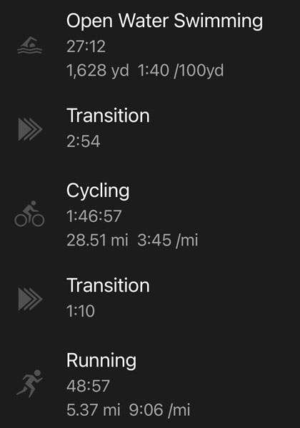 I covered the 1,500 meters plus the jog to the transition area in 27:13.