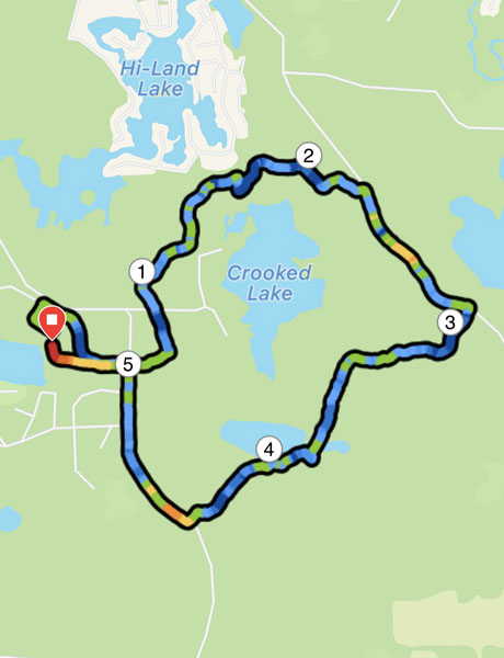 After a little stretch of running on the road we made our way to trails that wrap around Crooked Lake. Since we had gotten so much rain I had debated swapping to trail shoes. I’m glad I didn’t waste extra time doing that because the surface was just fine in my regular road shoes. Most of the trail was a sandy/dirt surface. There were some rocks and roots but I’m used to running on those kinds of trails and this wasn’t any more extreme than what I’m used to. There were some pretty good ups and downs too. This race was not an easy one!