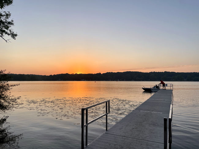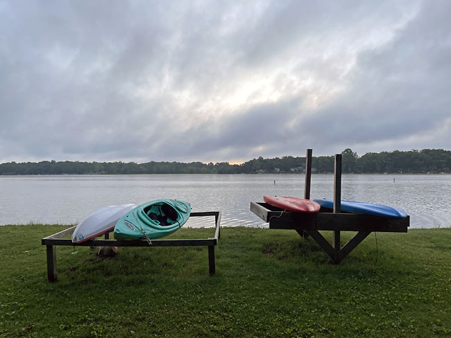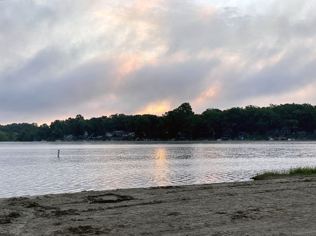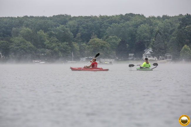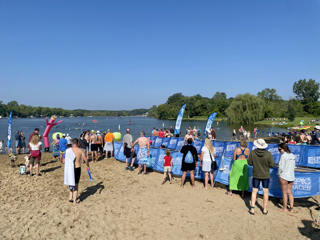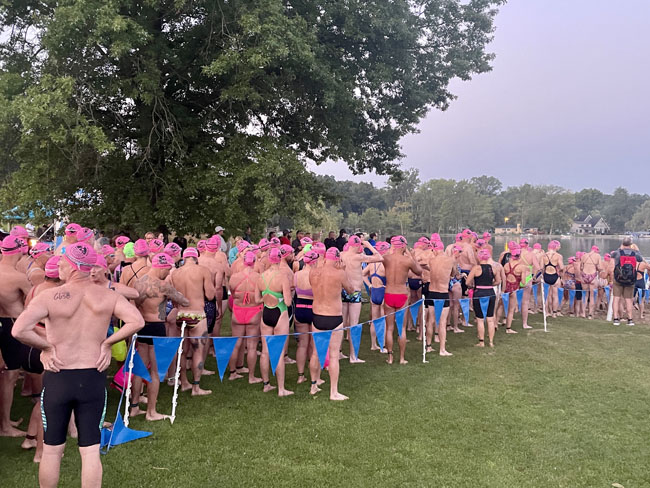 The 10K swimmers would swim out to the beach at North Star Reach (a camp for kids with serious health issues) then turn around and swim back. I caught a bus with other 5K swimmers around 6:45 that took us to our starting point by North Star Reach. When I arrived the sun was just rising over Patterson Lake. The weather was perfect this year. It was a cool morning and would climb to the 80s later in the day.