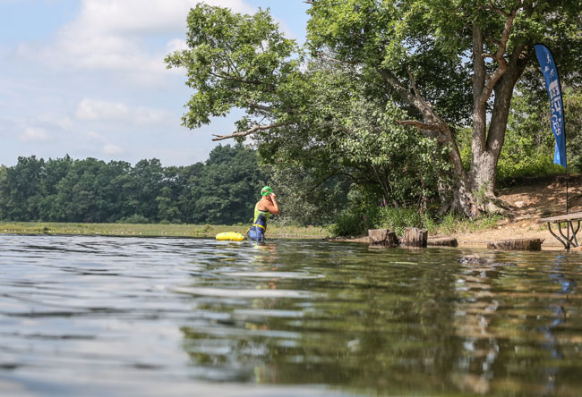 In general, the swim went well and was fairly uneventful. When I saw the aid station one mile into the swim I decided I’d rather keep moving. I’ve done plenty of swims where I go for two miles straight without stopping for a drink and figured I’d be fine. There was one lake that got really shallow, and one stretch that had some weeds to navigate through. I enjoyed the areas that were wide open where I felt like I had more space.