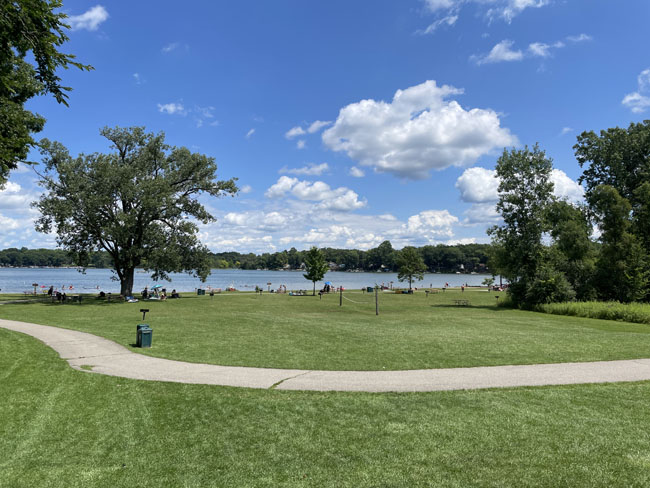 In 2021, I started about 17 minutes after the first 5K swimmer. However, it only took me 7-8 minutes to start the two other times I did the race because there was a steady flow of swimmers going into the water every few seconds. It didn’t seem like the crowd was thinning very much this time so after half an hour of standing around I decided I should go sit at a picnic table and get off of my feet. I made another porta potty stop too since I had time to kill. I tried not to get too anxious but I was shivering and wished I could just start. It didn’t help that I had gotten into the water earlier and didn’t have anything to keep me warm since my gear was being taken back to where we’d finish.