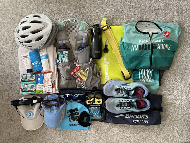 I continue to learn good lessons each time I do this race. The first year I was hungry by the end and got a calf cramp before the finish. I ate a total of three Picky Bars this year (one as I left home, one when I arrived an hour and a half later, and one on the bus ride to the start) which seemed to be perfect. The calf cramp taught me to hydrate more, so I drank at one aid station and had my own bottle with an electrolyte drink prior to the race. Last year I drank Gatorade at one of the aid stations and felt sick for the rest of the swim so I learned not to do that again. Sometimes the concentration of sports drinks is too sweet for me and I’m thankful that my own pre-race mix was enough to get me through without cramping. After I was disappointed in my time last year, Heather had told me that drag from wearing a swim buoy may have slowed me down. I bypassed it this year and maybe that did make a difference in my time.
