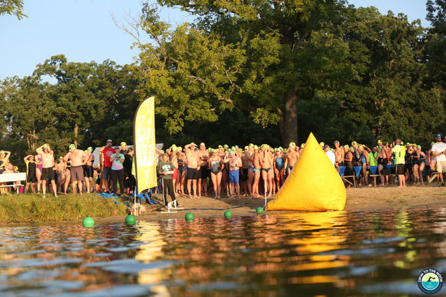 Typically we wait until the first 10K swimmers arrive before we are sent into the water for the 5K start. The announcer told us that we would start at 7:30 sharp and that we should get our bags to gear check. I packed up my jacket and other stuff and got in the lake to get acclimated and get my goggles situated. Then it was time to wait.